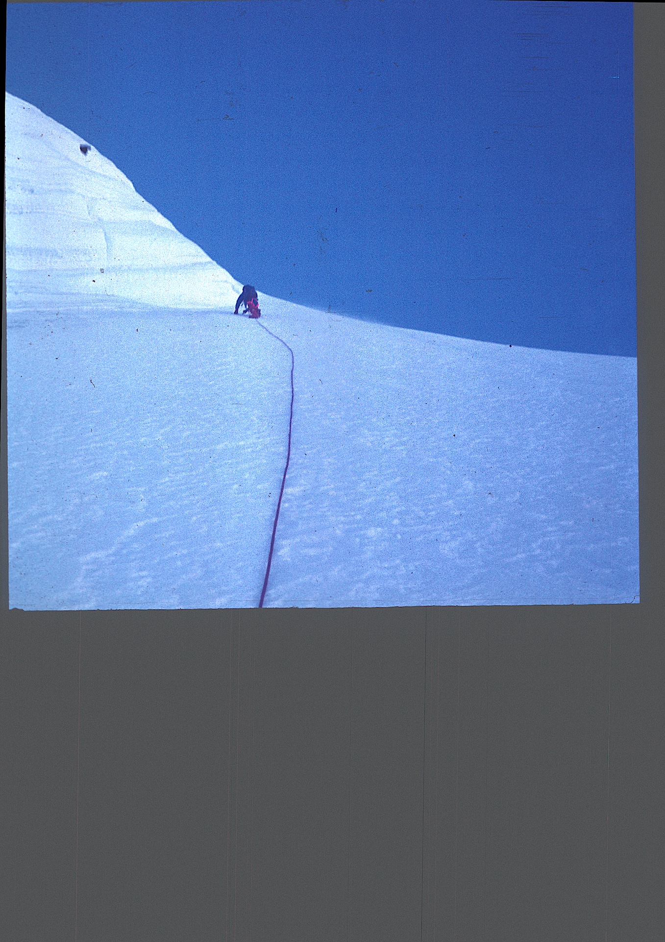 With one broken crampon, I hobbled up the final ice fields with care. Luckily I averted disaster when I slipped and began to slide, self arresting before spinning out of control.